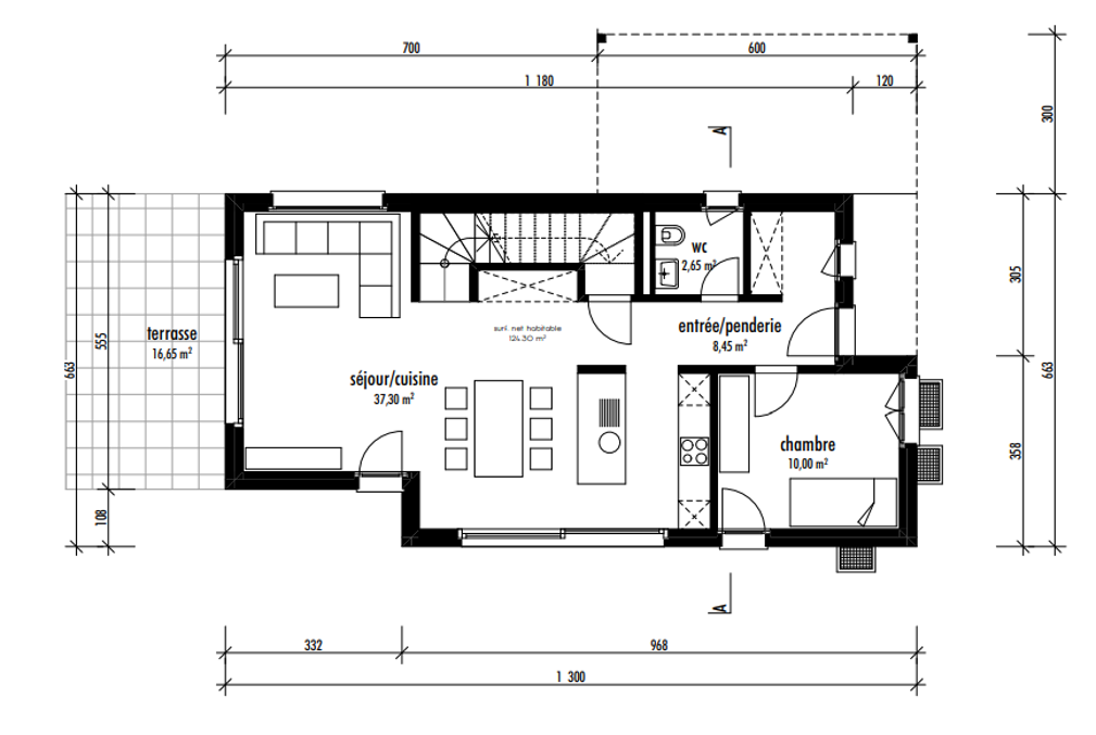 Un hall d'entrée avec son vestiaire, un WC, un séjour/salle à manger, une cuisine avec économat.