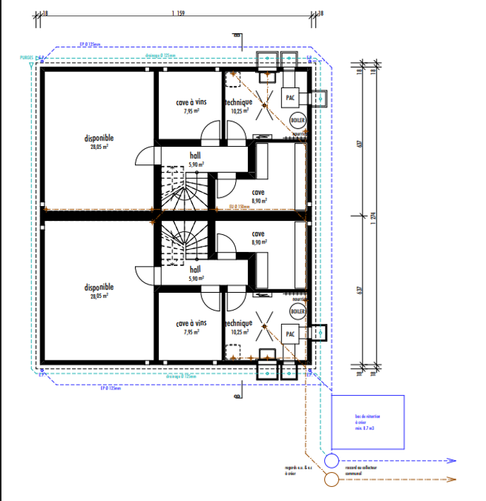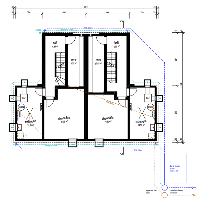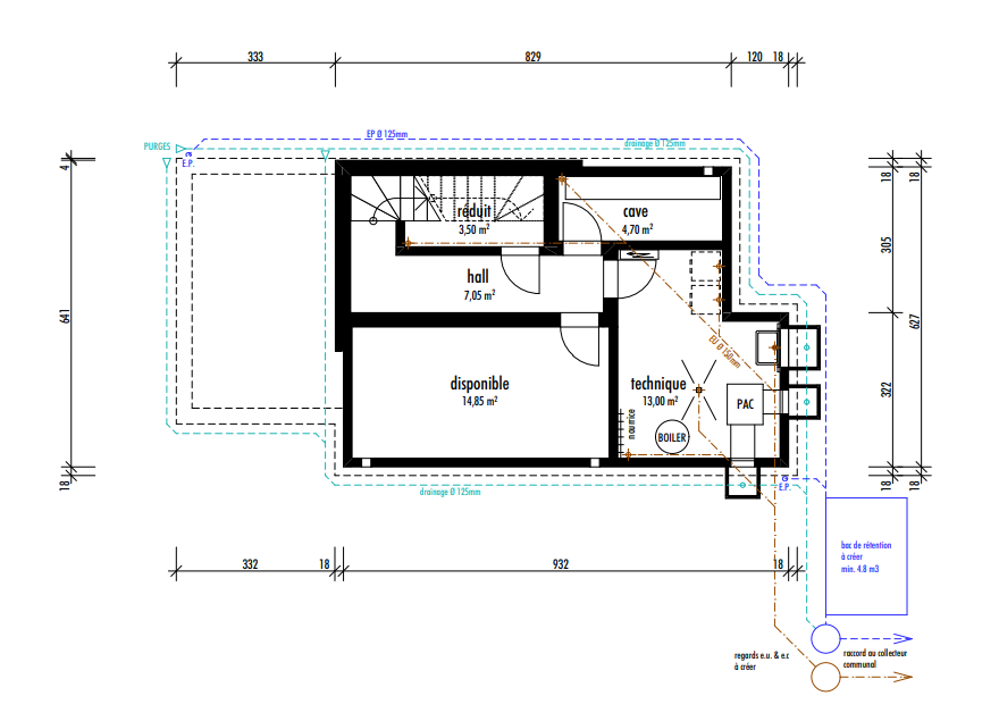 Un hall deservant un local technique, une cave, un disponible et un réduit.