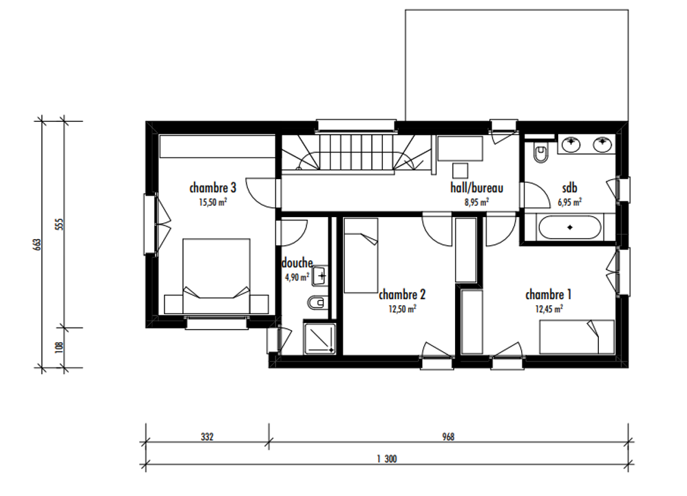 Un hall/bureau, une suite parentale avec son WC/douche privatif ainsi que 2 chambres et une grande salle de bain.